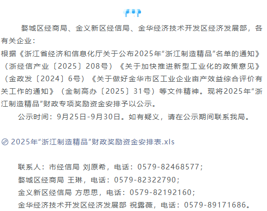 婺城區(qū)經(jīng)商局、金義新區(qū)經(jīng)信局、金華經(jīng)濟技術開發(fā)區(qū)經(jīng)濟發(fā)展部,各有關企業(yè):根據(jù)《浙江省經(jīng)濟和信息化廳關于公布2025年“浙江制造精品”名單的通知》(...