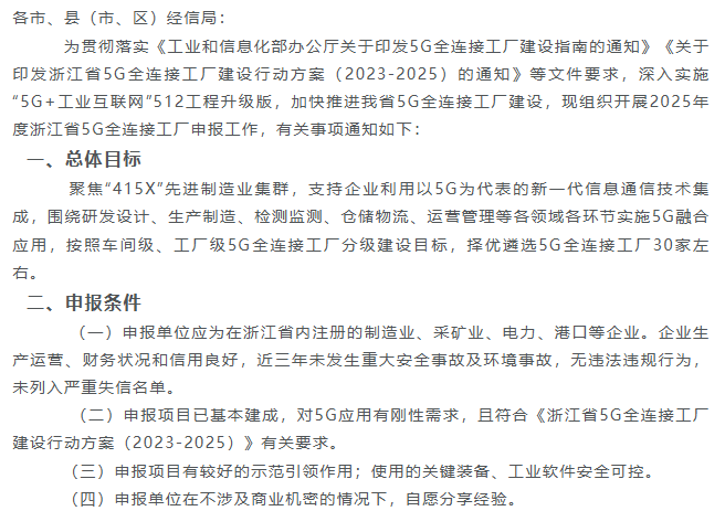 各市、縣(市、區(qū))經(jīng)信局: 為貫徹落實《工業(yè)和信息化部辦公廳關于印發(fā)5G全連接工廠建設指南的通知》《關于印發(fā)浙江省5G全連接工廠建設行動方案(20...