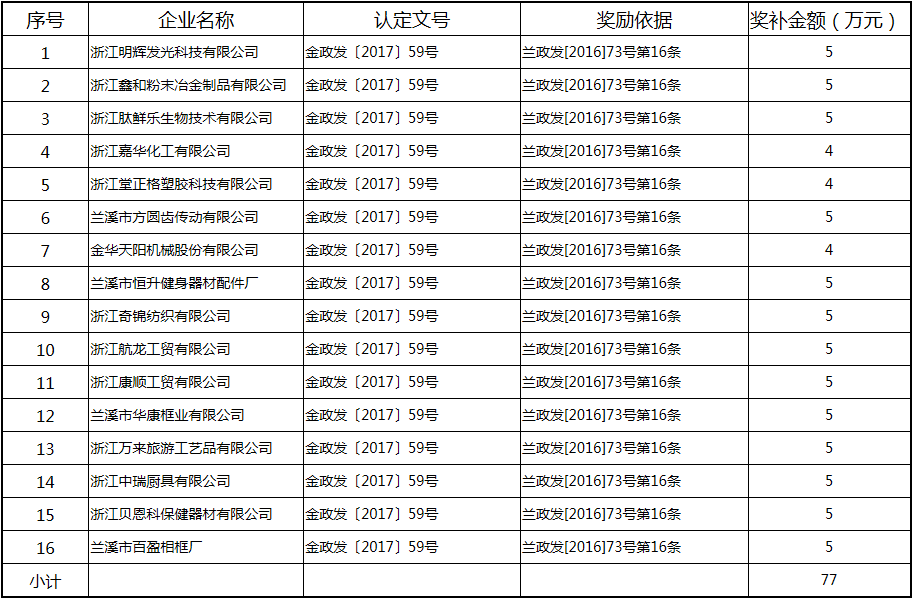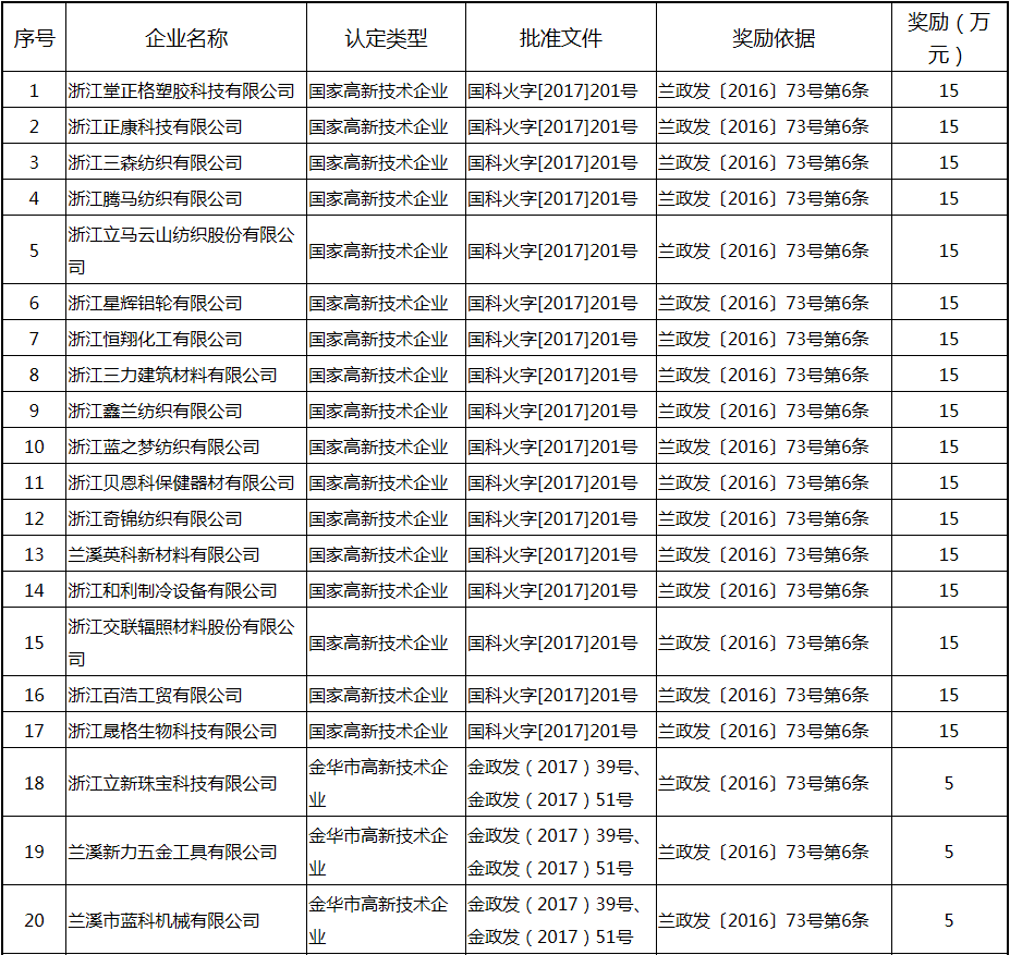 根據(jù)《關(guān)于實(shí)施創(chuàng)新驅(qū)動(dòng)戰(zhàn)略大力推進(jìn)大眾創(chuàng)業(yè)萬眾創(chuàng)新的若干意見》(蘭政發(fā)〔2016〕73號(hào))和《蘭溪市科技創(chuàng)新券實(shí)施管理辦法》(蘭科局〔2016〕17號(hào))等文件精神,現(xiàn)將2017年度科技創(chuàng)新專項(xiàng)資金獎(jiǎng)勵(lì)及補(bǔ)助方案予以公示,公示期五個(gè)工作日,自2018年 7月3日至 7月9日。公示期內(nèi),如對(duì)公示擬補(bǔ)助對(duì)象有疑議的,請(qǐng)及時(shí)向市科技局辦公室反映。